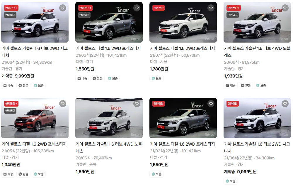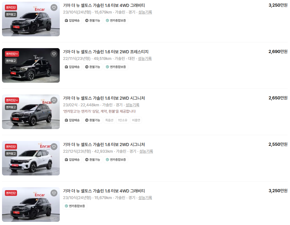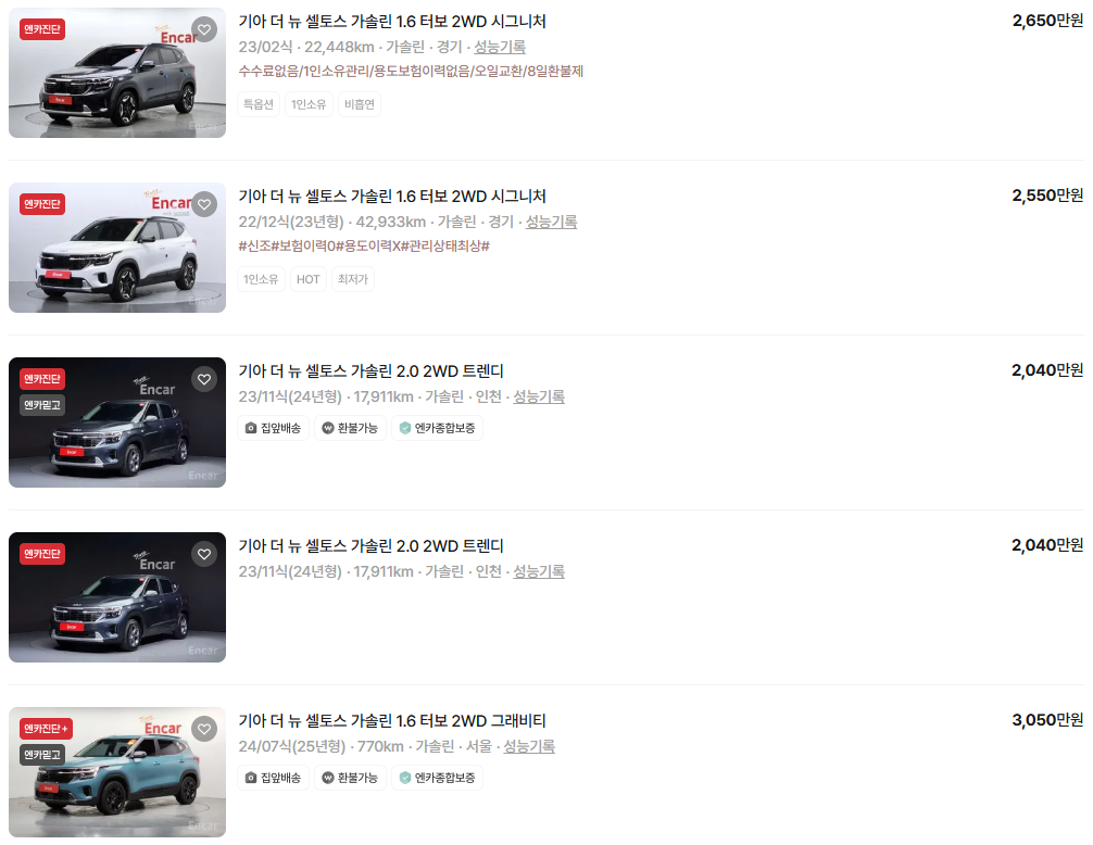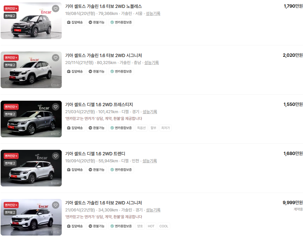 가장 이용자가 많은 엔카에는 셀토스 중고차 매물이 약 2,354대 등록되어 있습니다. 아래는 현재 중고차 시장에서의 셀토스 중고차 시세와 매물표입니다.