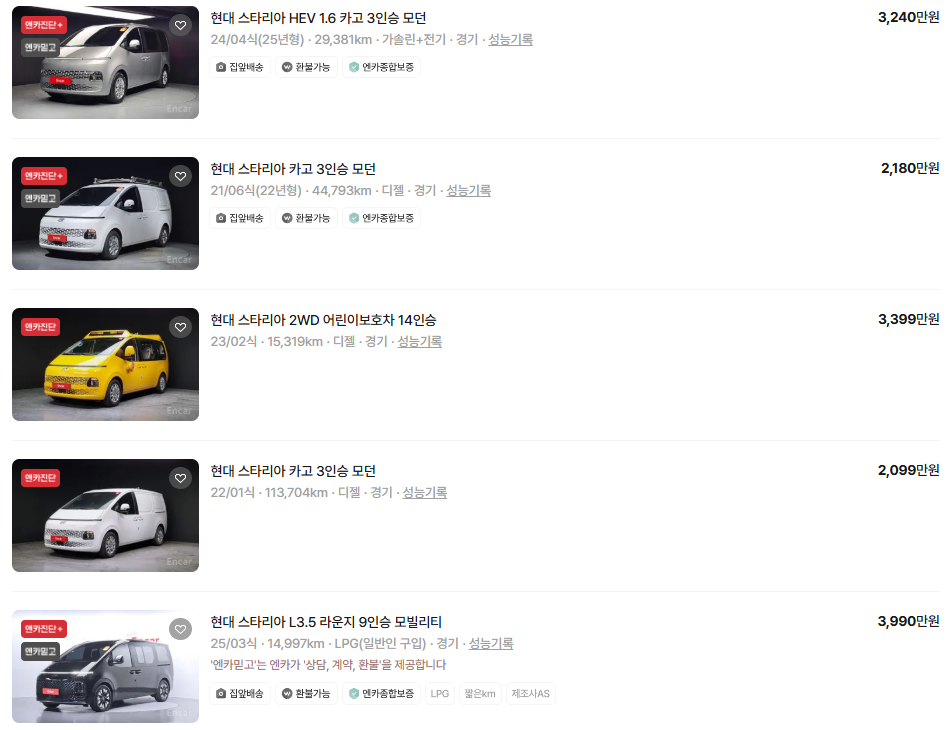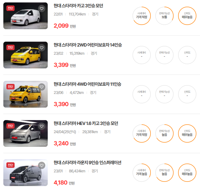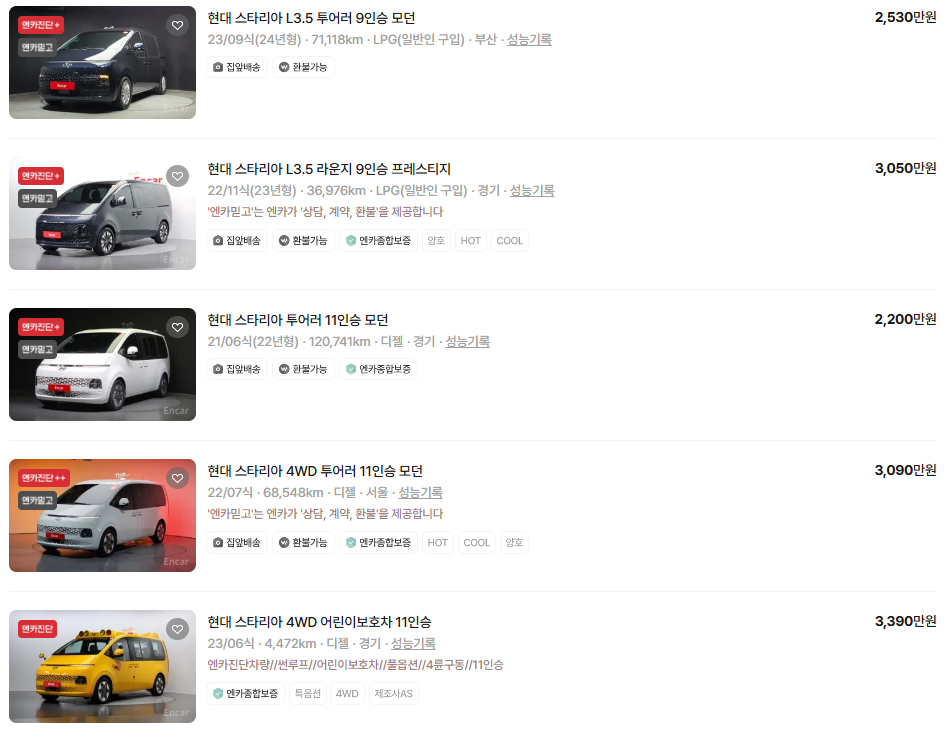 가장 이용자가 많은 엔카에는 스타리아 중고차 매물이 약 1,714대 등록되어 있습니다. 아래는 현재 중고차 시장에서의 스타리아 중고차 시세와 매물표입니다.