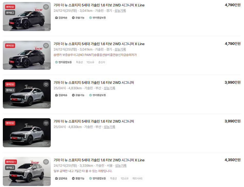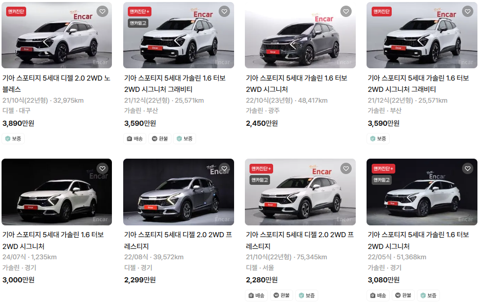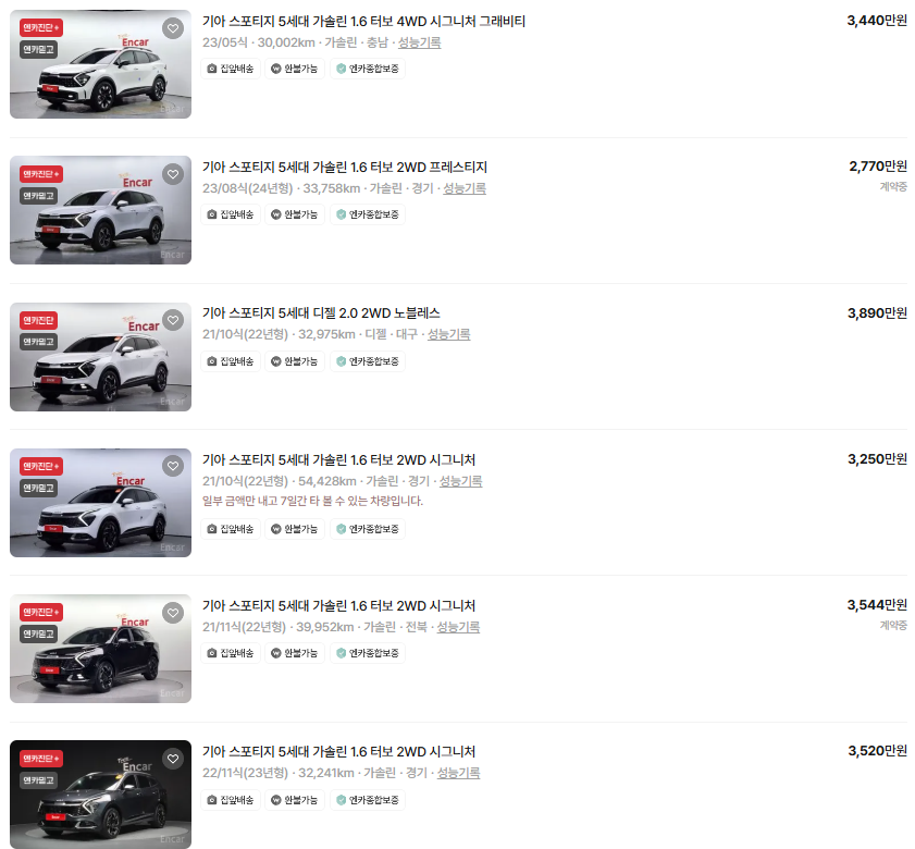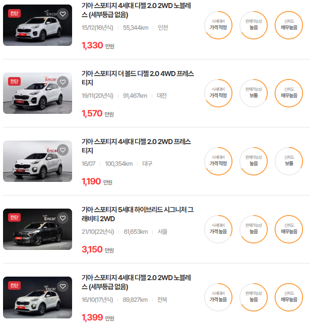 가장 이용자가 많은 엔카에는 스포티지 중고차 매물이 약 3,197대 등록되어 있습니다. 아래는 현재 중고차 시장에서의 스포티지 중고차 시세와 매물표입니다.