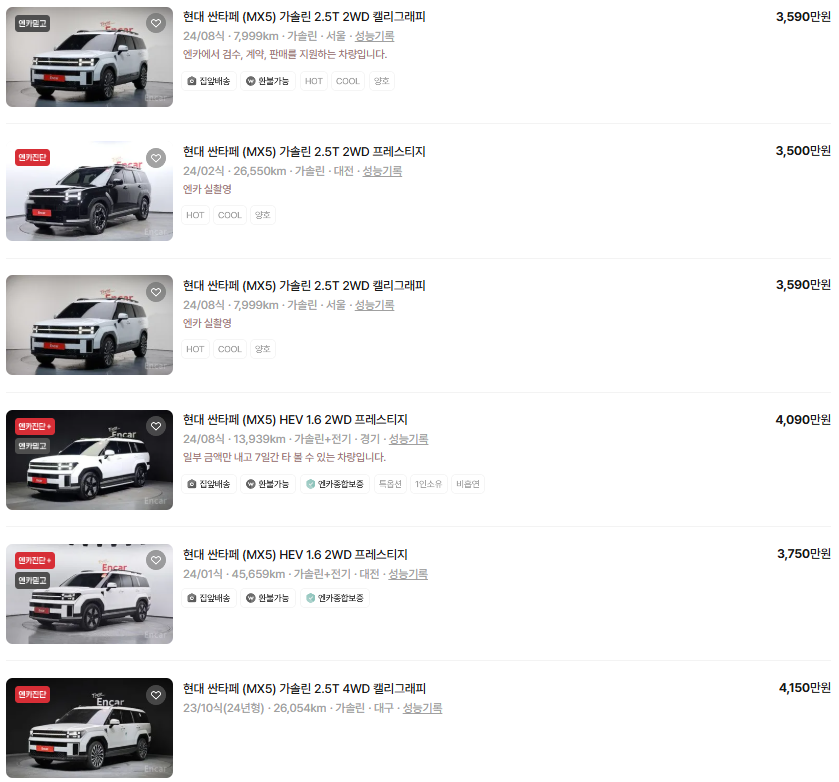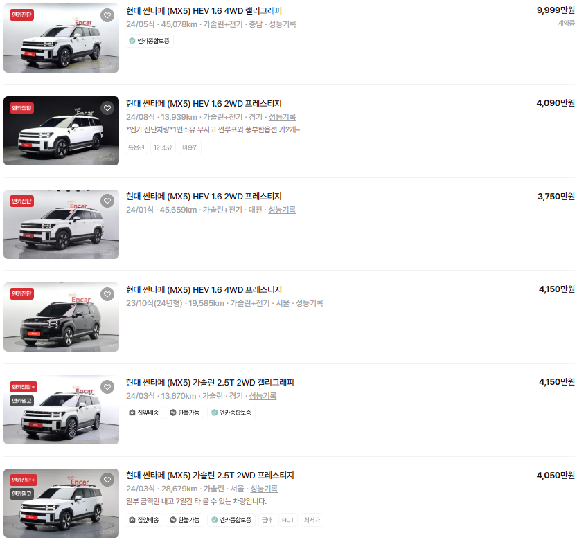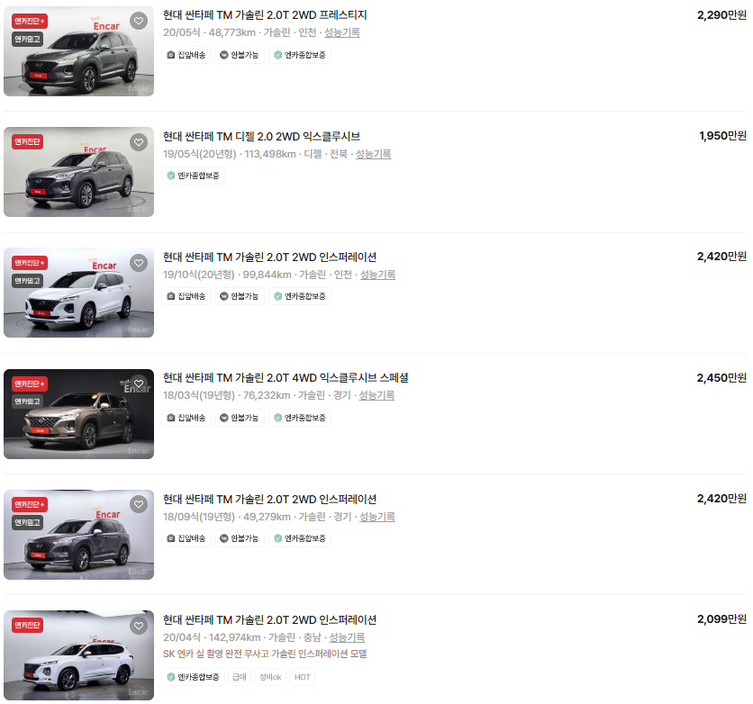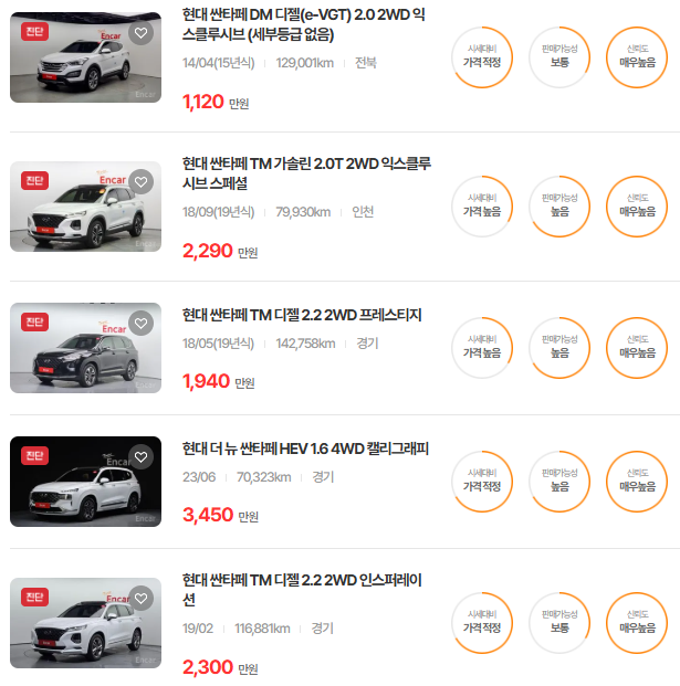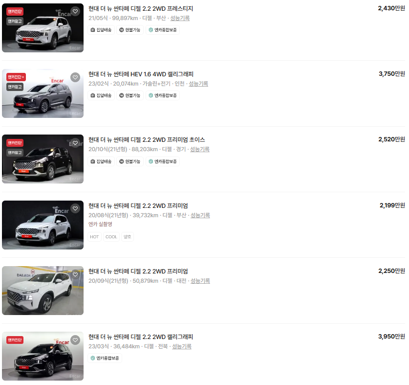 가장 이용자가 많은 엔카에는 싼타페 중고차 매물이 약 5,004대 등록되어 있습니다. 아래는 현재 중고차 시장에서의 싼타페 중고차 시세와 매물표입니다.