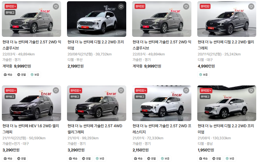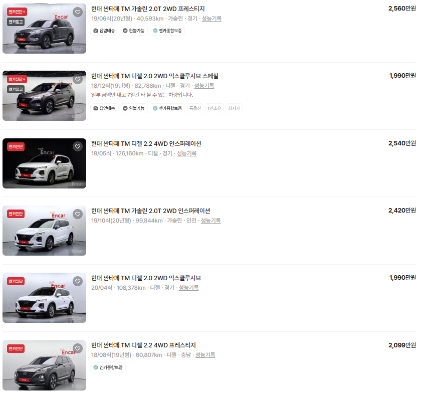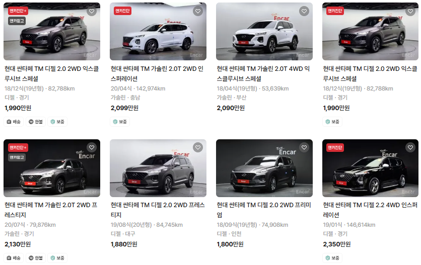 싼타페 중고차 시세표입니다. 우리나라에서 가장 유명한 중고차 매매사이트인 엔카 사이트에 등록된 중고차 매물기준입니다. 참고로 국내 중고차 사이트는 엔카, KB차차차, 보배드림 등이 있습니다.