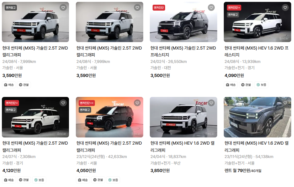싼타페(MX5)는 2023 ~ 2025년식 싼타페 모델이며, 중고차 시세는 3034 ~ 4738만 원입니다. 아래는 현재 중고차시장에 매물로 나와있는싼타페(MX5)의 중고차시세와 가격표입니다.