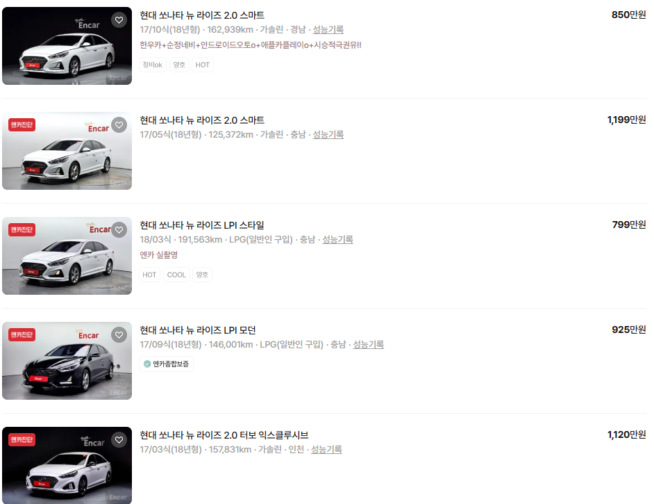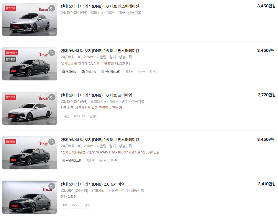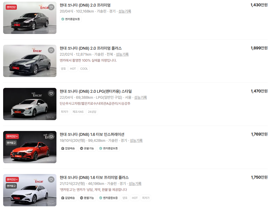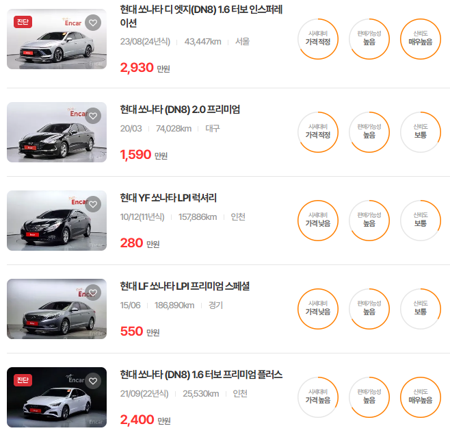 가장 이용자가 많은 엔카에는 쏘나타 중고차 매물이 약 4,704대 등록되어 있습니다. 아래는 현재 중고차 시장에서의 쏘나타 중고차 시세와 매물표입니다.
