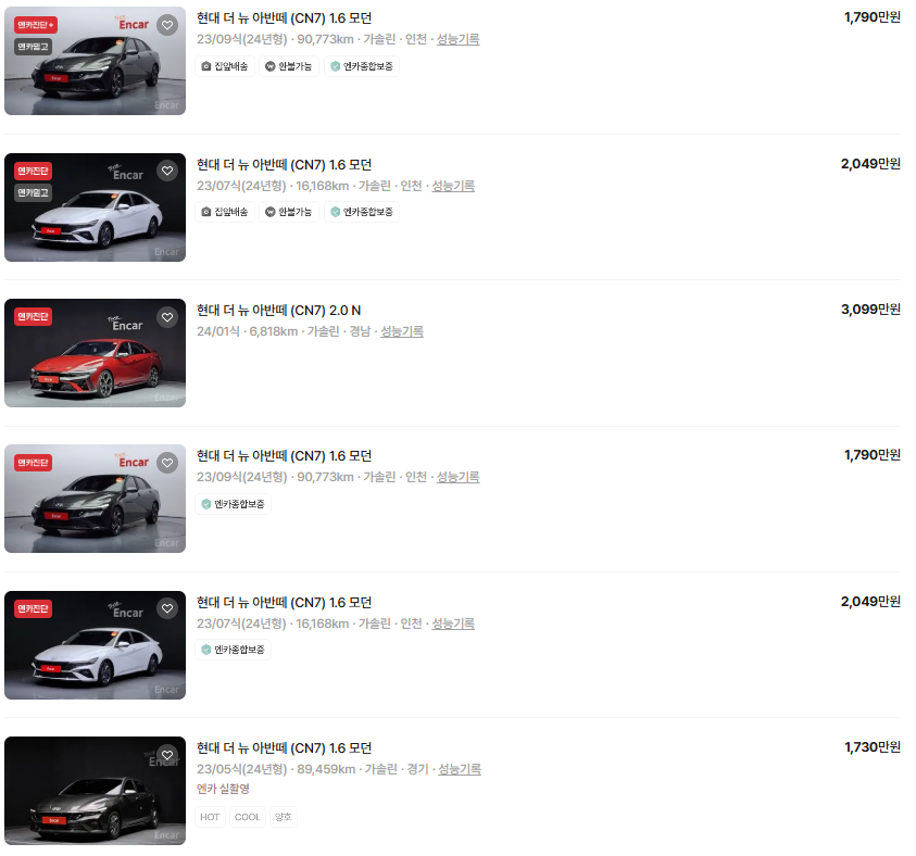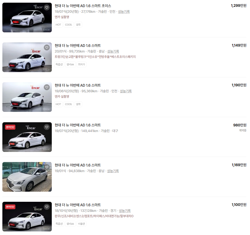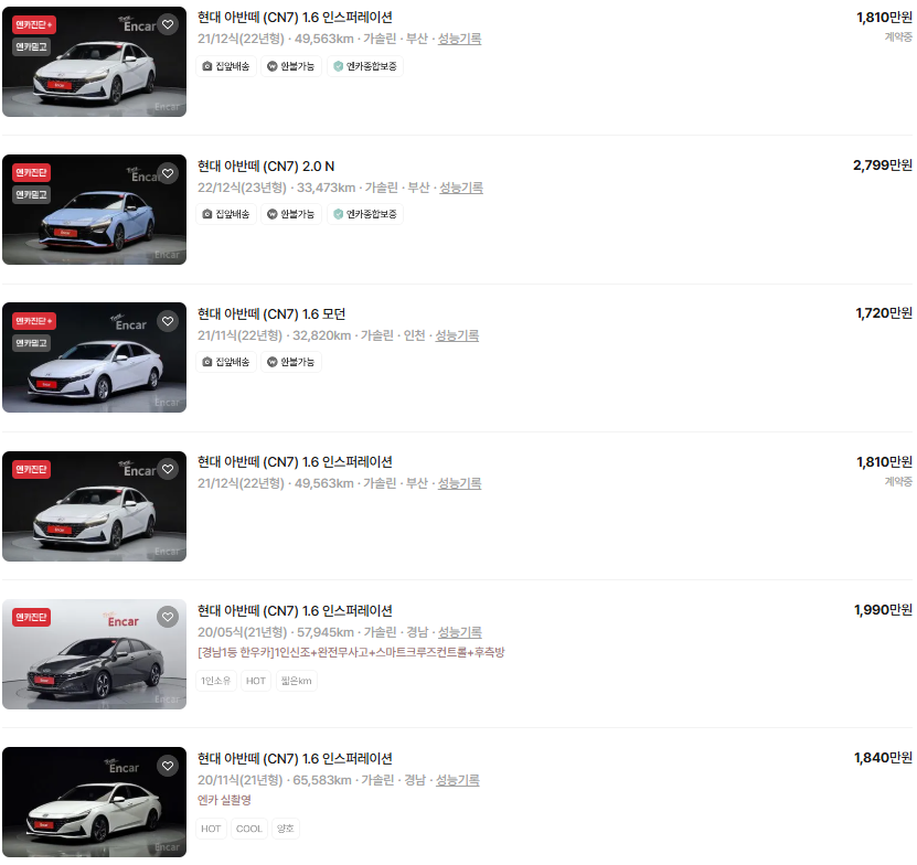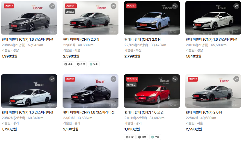 가장 이용자가 많은 엔카에는 아반떼 중고차 매물이 약 5,905대 등록되어 있습니다. 아래는 현재 중고차 시장에서의 아반떼 중고차 시세와 매물표입니다.