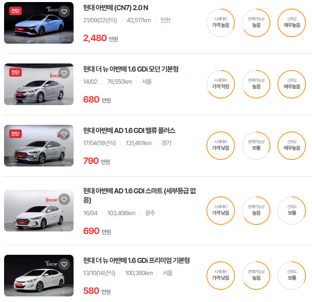 👇 👇 아반떼 경쟁차량 중고차 정보 👇 👇