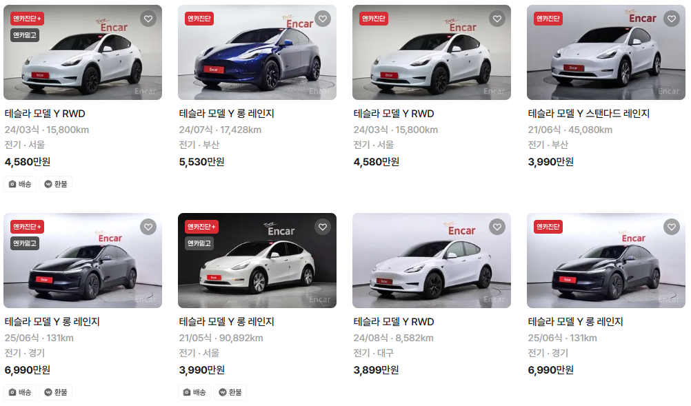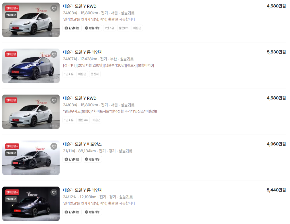 가장 이용자가 많은 엔카에는 테슬라 모델Y 중고차 매물이 약 441대 등록되어 있습니다. 아래는 현재 중고차 시장에서의 테슬라 모델Y 중고차 시세와 매물표입니다.