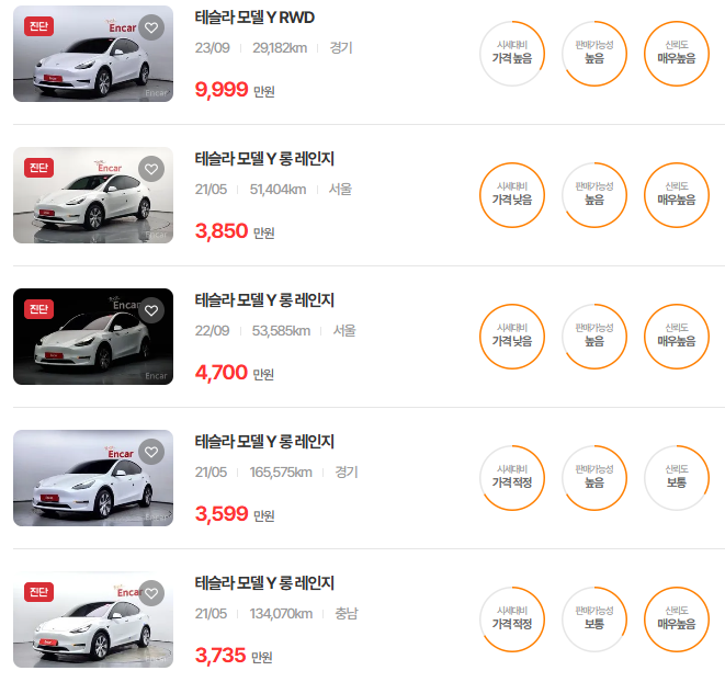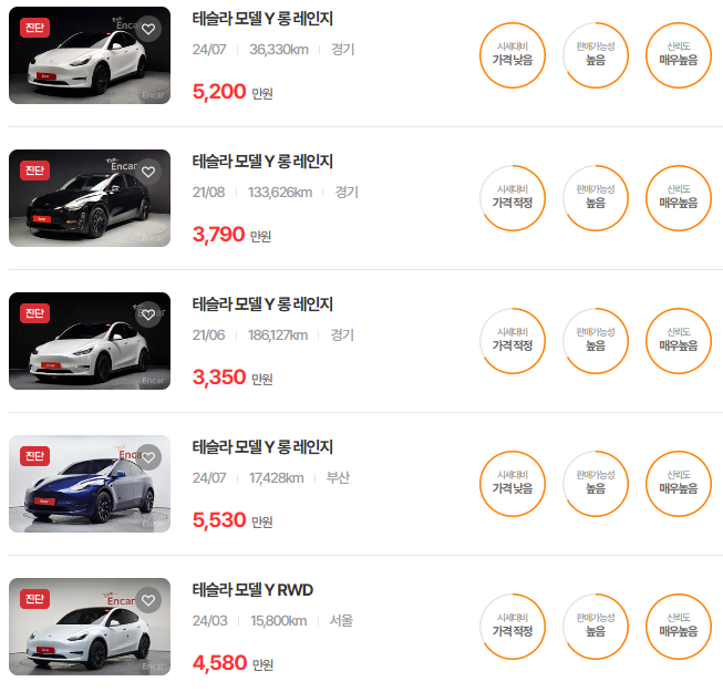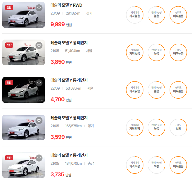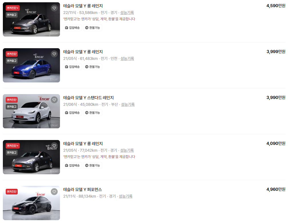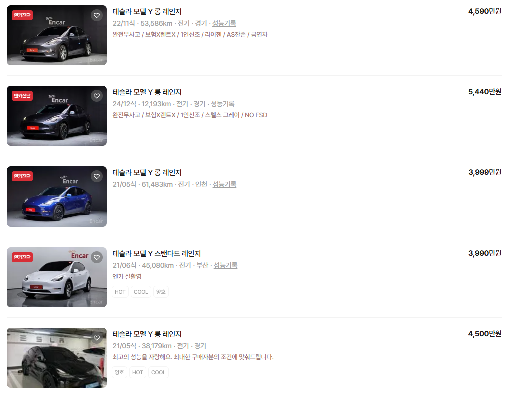 테슬라 모델Y 중고차 시세표입니다. 우리나라에서 가장 유명한 중고차 매매사이트인 엔카 사이트에 등록된 중고차 매물기준입니다. 참고로 국내 중고차 사이트는 엔카, KB차차차, 보배드림 등이 있습니다.