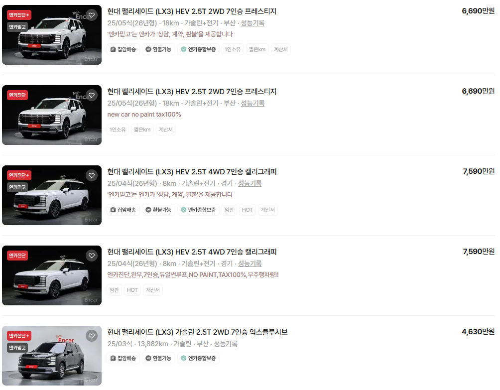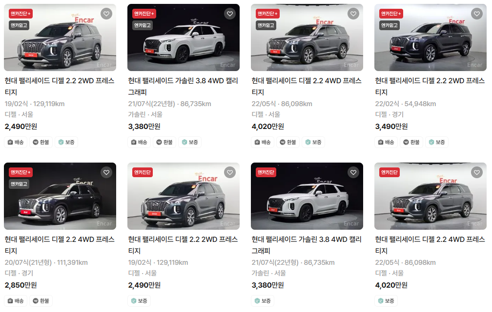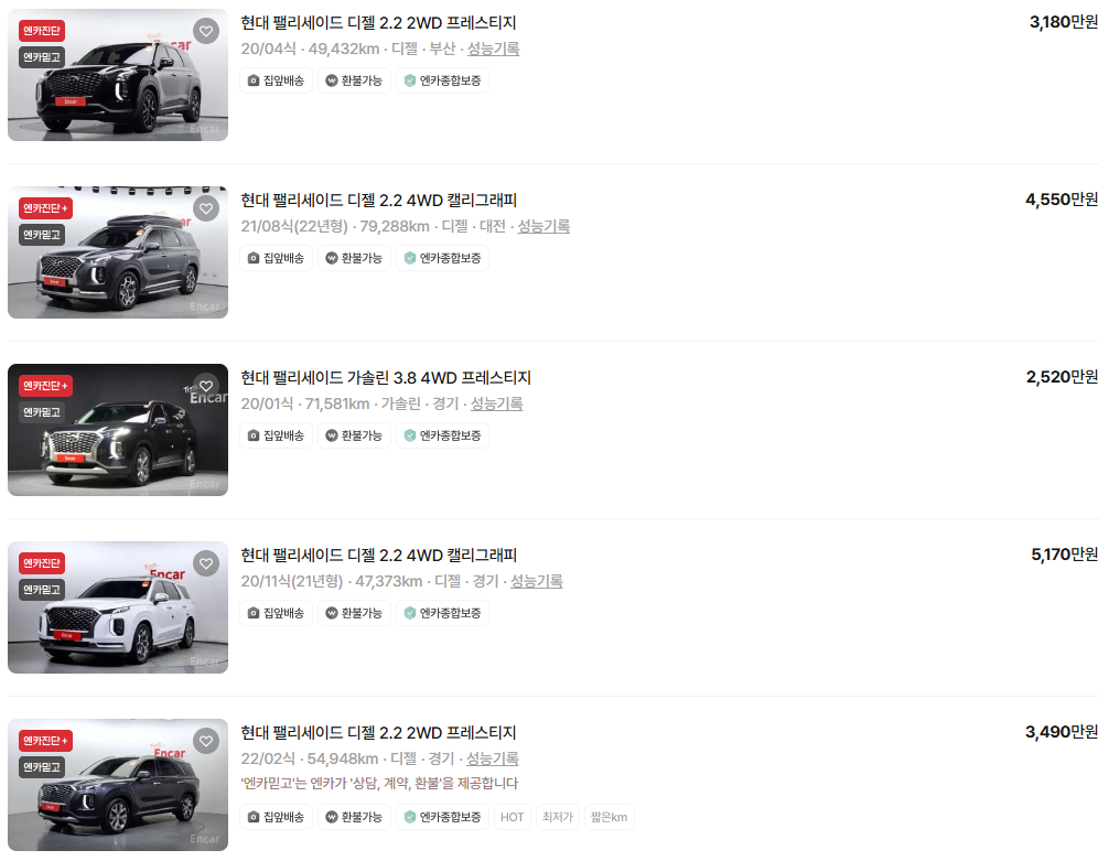 가장 이용자가 많은 엔카에는 팰리세이드 중고차 매물이 약 3,454대 등록되어 있습니다. 아래는 현재 중고차 시장에서의 팰리세이드 중고차 시세와 매물표입니다.