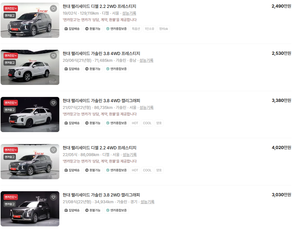 가장 이용자가 많은 엔카에는 팰리세이드 중고차 매물이 약 3,454대 등록되어 있습니다. 아래는 현재 중고차 시장에서의 팰리세이드 중고차 시세와 매물표입니다.