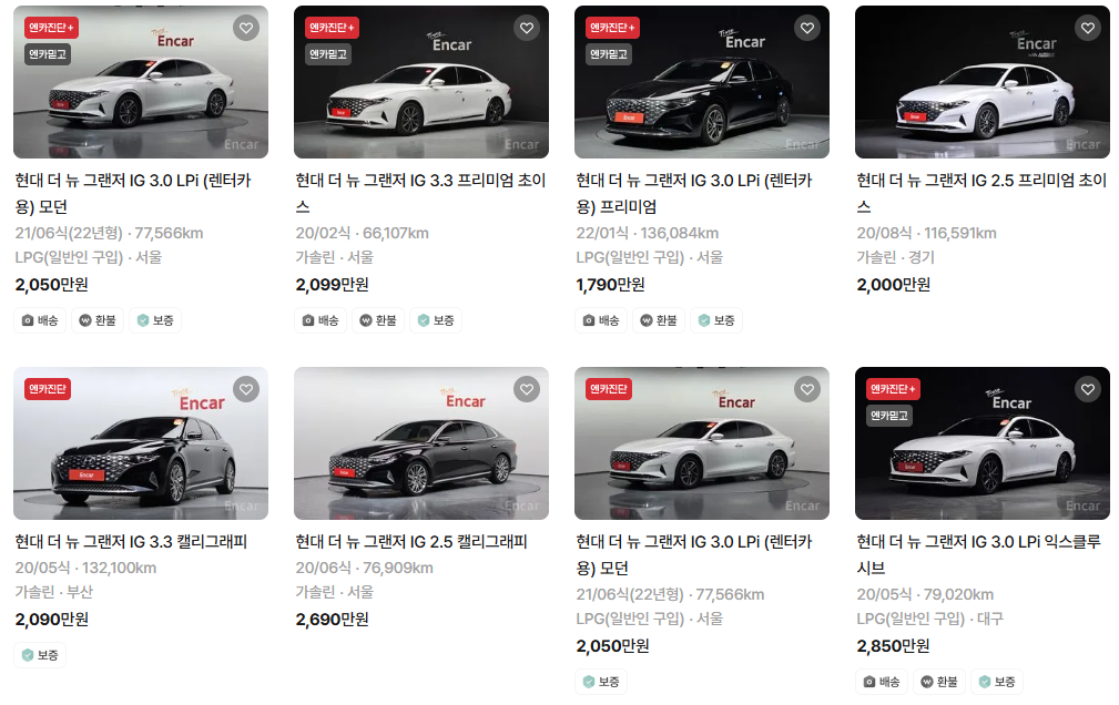 그랜저 중고차 시세표입니다. 우리나라에서 가장 유명한 중고차 매매사이트인 엔카 사이트에 등록된 중고차 매물기준입니다. 참고로 국내 중고차 사이트는 엔카, KB차차차, 보배드림 등이 있습니다.