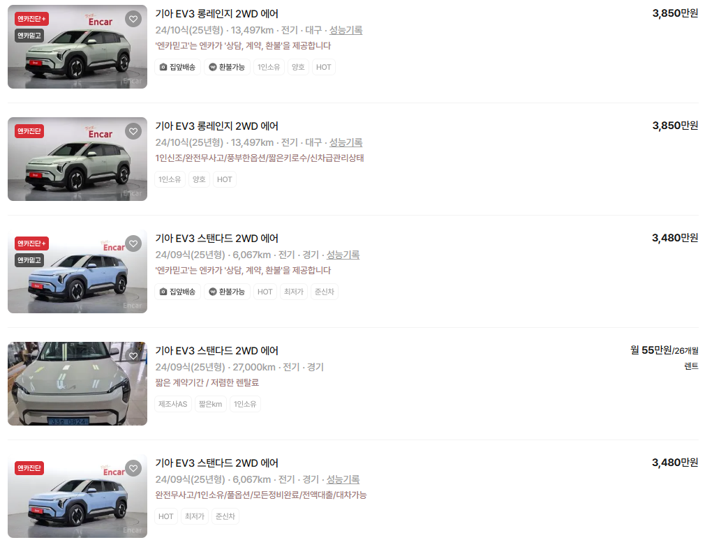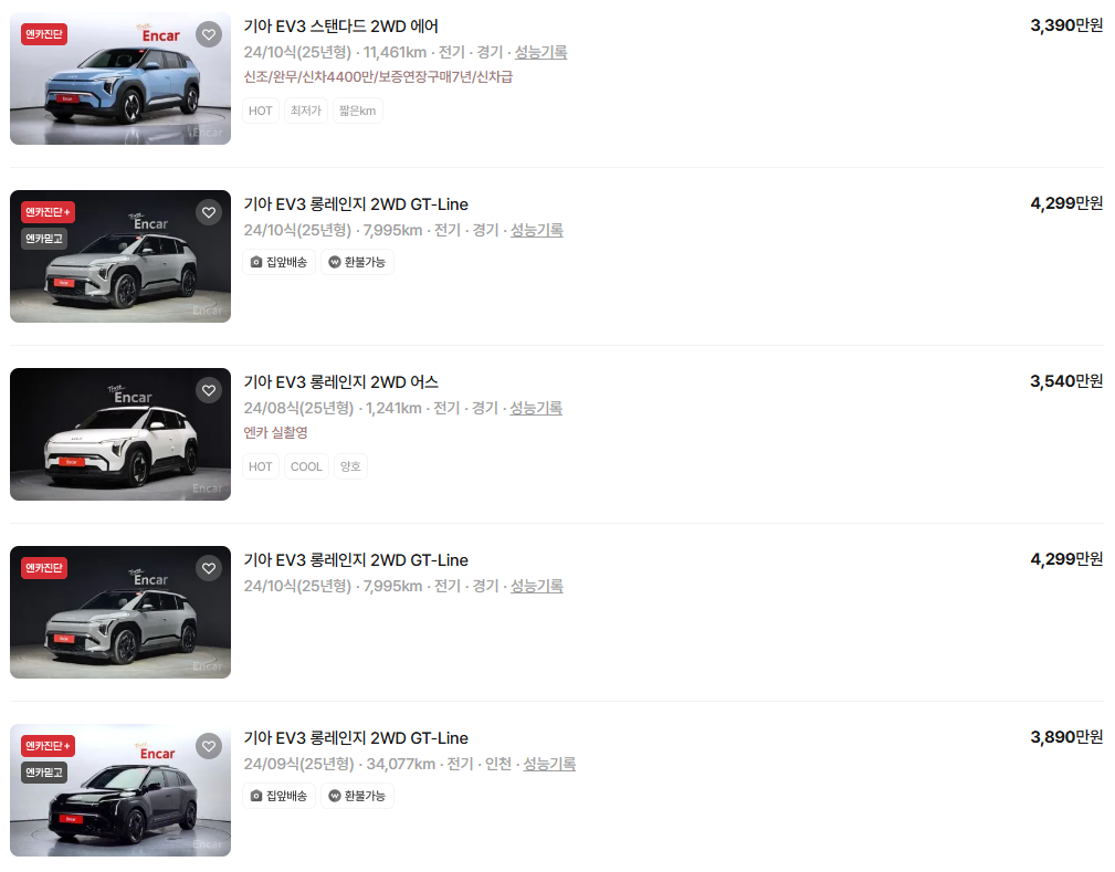 가장 이용자가 많은 엔카에는 EV3 중고차 매물이 약 54대 등록되어 있습니다. 아래는 현재 중고차 시장에서의 EV3 중고차 시세와 매물표입니다.
